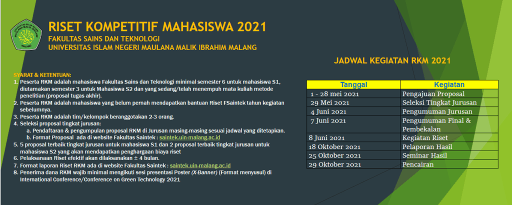 SYARAT & KETENTUAN: 1.Peserta RKM adalah mahasiswa Fakultas Sains dan Teknologi minimal semester 6untukmahasiswaS1,diutamakansemester 3 untukMahasiswaS2dan yang sedang/telah menempuh mata kuliah metode penelitian (proposal tugas akhir). 2.Peserta RKM adalah mahasiswa yang belum pernah mendapatkan bantuan Riset FSaintek tahun kegiatan sebelumnya. 3.PesertaRKM adalahtim/kelompokberanggotakan2–3 orang. 4.Seleksi proposal tingkat jurusan:a.Pendaftaran & pengumpulan proposal RKM di Jurusan masing–masing sesuai […]