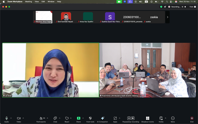 Dalam rangka internasionalisasi program studi dan peningkatan kualitas pembelajaran, Prodi Kimia Fakultas Sains dan Teknologi UIN Maulana Malik Ibrahim Malang menghadirkan dosen tamu (guest lecturer) dari Universiti Sains Islam Malaysia (USIM). Kegiatan yang berlangsung secara online ini merupakan bagian dari upaya berkelanjutan untuk meningkatkan standar internasional dan memperluas jaringan akademik global, sekaligus memberikan eksposur kepada mahasiswa tentang praktik pendidikan kimia di negara lain.