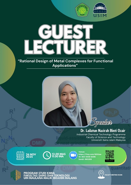 Guest lecturer yang hadir adalah Dr. Lailatun Nazirah Binti Ozair, seorang peneliti senior yang telah mempublikasikan puluhan artikel di jurnal internasional. Beliau memberikan serangkaian kuliah dan sharing session kepada mahasiswa dan dosen Prodi Kimia dengan topik yang menarik.Materi yang dibawakan adalah Rational Design of Metal Complexes for Functional Applications dan peluang kolaborasi riset dan pertukaran mahasiswa antara UIN Malang dan USIM.