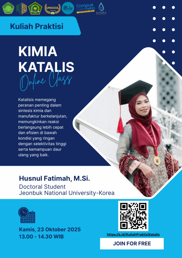 Program Studi Kimia UIN Malang berhasil menyelenggarakan Kuliah Praktisi dengan tema “Kimia Katalis” pada Kamis, 23 Oktober 2025. Acara yang berlangsung secara daring mulai pukul 13.00 hingga 14.30 WIB ini menghadirkan Husnul Fatimah, M.Si., yang merupakan alumni Prodi Kimia UIN Malang yang kini tengah menempuh pendidikan doktor di Jeonbuk National University, Korea Selatan, sebagai narasumber utama.