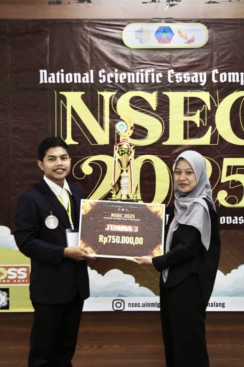 Prestasi membanggakan telah ditorehkan oleh Rangga Dwi Prayoga, mahasiswa semester 7 Jurusan Kimia Fakultas Sains dan Teknologi (FST) UIN Maulana Malik Ibrahim Malang. Rangga sukses meraih Juara 3 dalam National Scientific Essay Competition (NSEC) 2025, ajang ilmiah tingkat nasional yang diselenggarakan oleh Dewan Eksekutif Mahasiswa (DEMA) Fakultas Sains dan Teknologi UIN Malang.