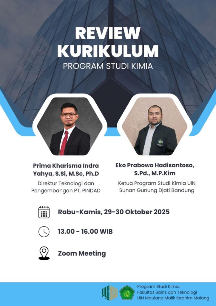 Program Studi Kimia Fakultas Sains dan Teknologi UIN Maulana Malik Ibrahim Malang menyelenggarakan kegiatan Review Kurikulum yang telah berlangsung pada Rabu-Kamis, 29-30 Oktober 2025. Kegiatan ini merupakan bagian dari upaya program studi untuk terus meningkatkan kualitas pendidikan dan menyesuaikan kurikulum dengan perkembangan ilmu pengetahuan serta kebutuhan dunia industri.